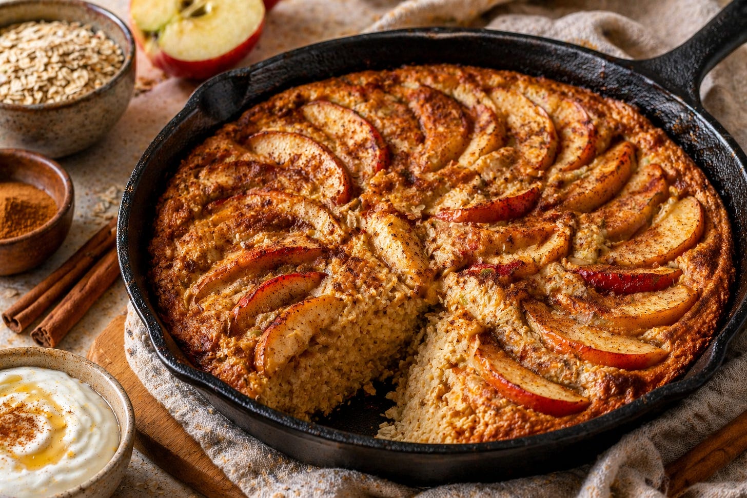 Butter, cinnamon, and apples hitting a warm skillet. That smell alone is worth making it. The apples get just slightly caramelized before the batter goes on top, and what comes out of the oven is somewhere between baked oatmeal and a Dutch baby. Soft and custardy in the center, lightly golden on top, warmly spiced throughout.