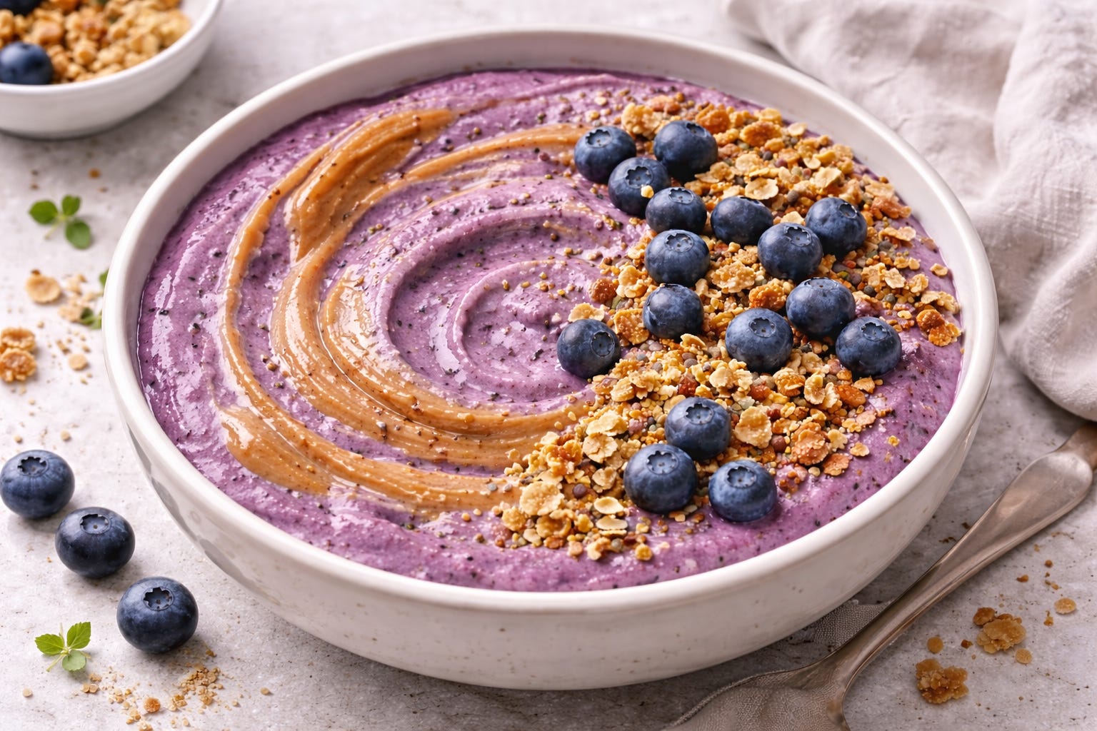 It isn’t a blended cup of fruit that tastes great for five minutes and leaves you hungry before you’ve finished your coffee. It’s thick, spoonable, deeply blueberry, with swirls of almond butter and enough crunch on top to make it feel like a proper meal.