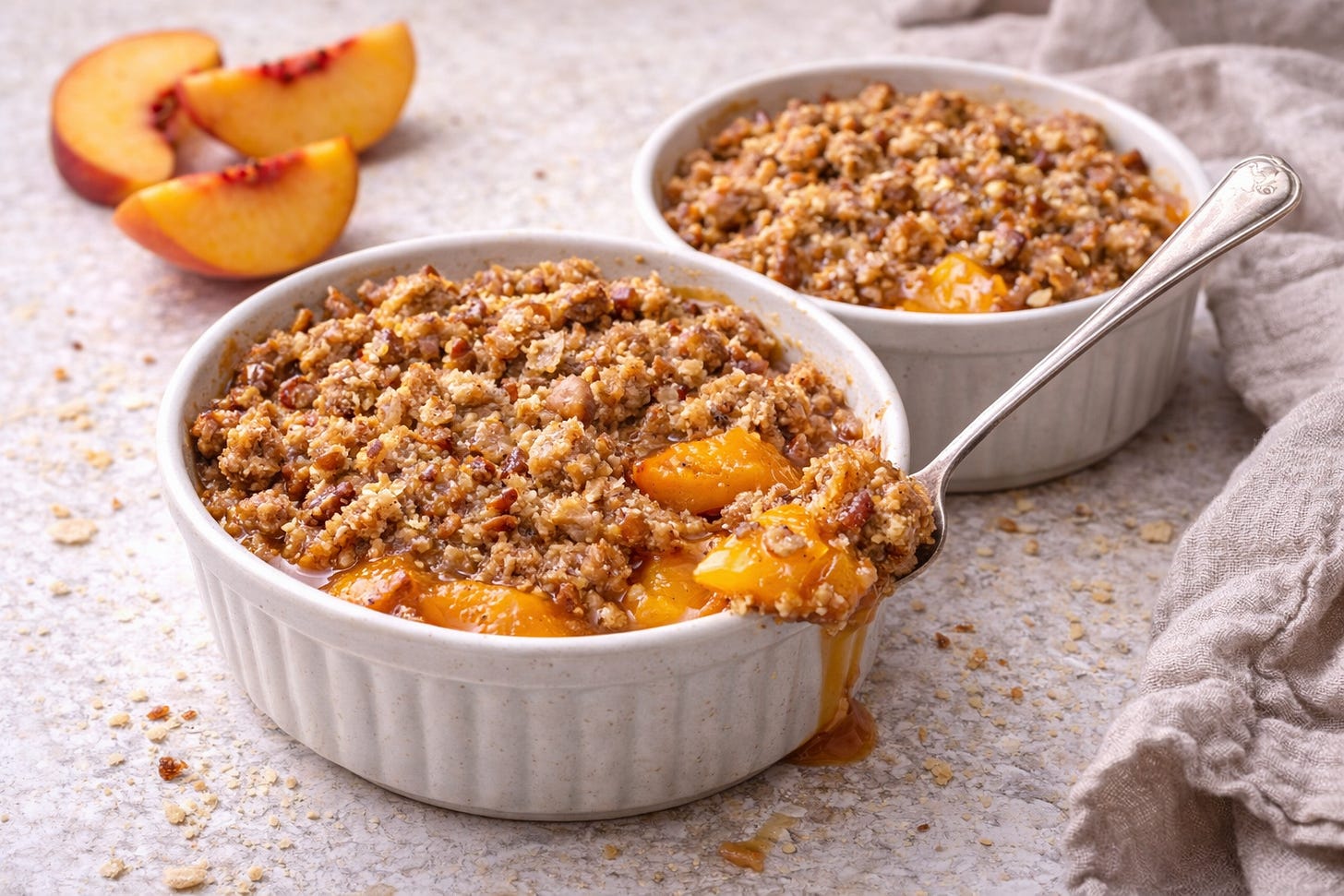 This one is different. Peaches bring natural sweetness and fiber without needing much added sugar at all. Almond flour and chopped pecans in the crumble add healthy fat and more fiber. A scoop of protein powder mixed into the topping is completely undetectable and pushes the protein up to 15 to 20 grams per serving. And butter, real butter browned until it’s slightly nutty and golden, makes the whole thing taste indulgent in a way that coconut oil simply cannot replicate.