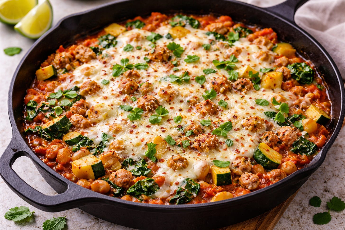 Ground turkey brings the protein base. Zucchini and spinach fold in fiber without making it feel like a vegetable dish. Add white beans or chickpeas and you push the fiber even higher without changing the flavor much at all. The marinara brings acidity and depth, and the cheese on top makes the whole thing feel indulgent in a way that a bowl of plain ground turkey never would.