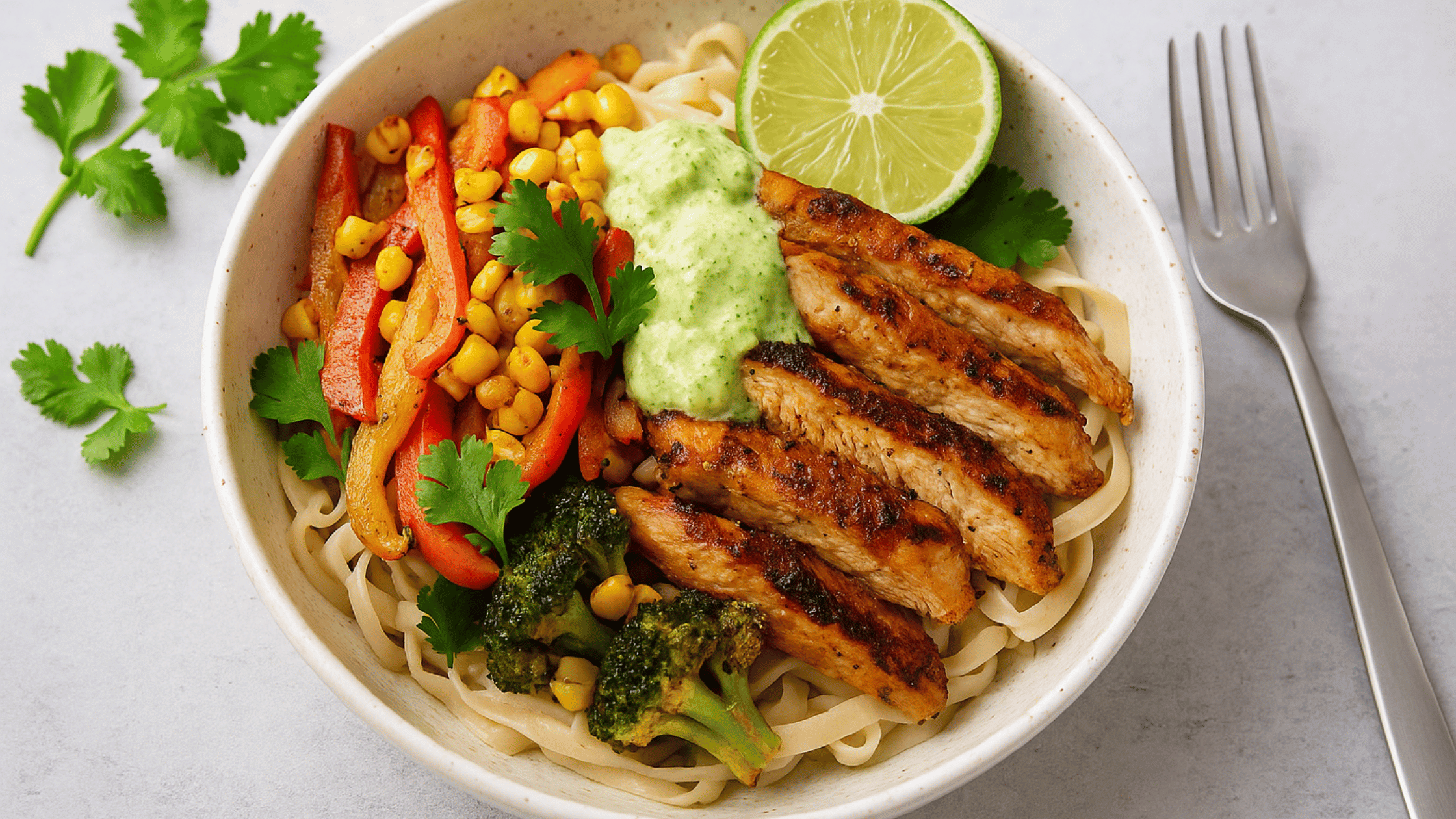 Chicken Fajita Pasta Bowl with Spicy Cilantro Lime Yogurt Sauce