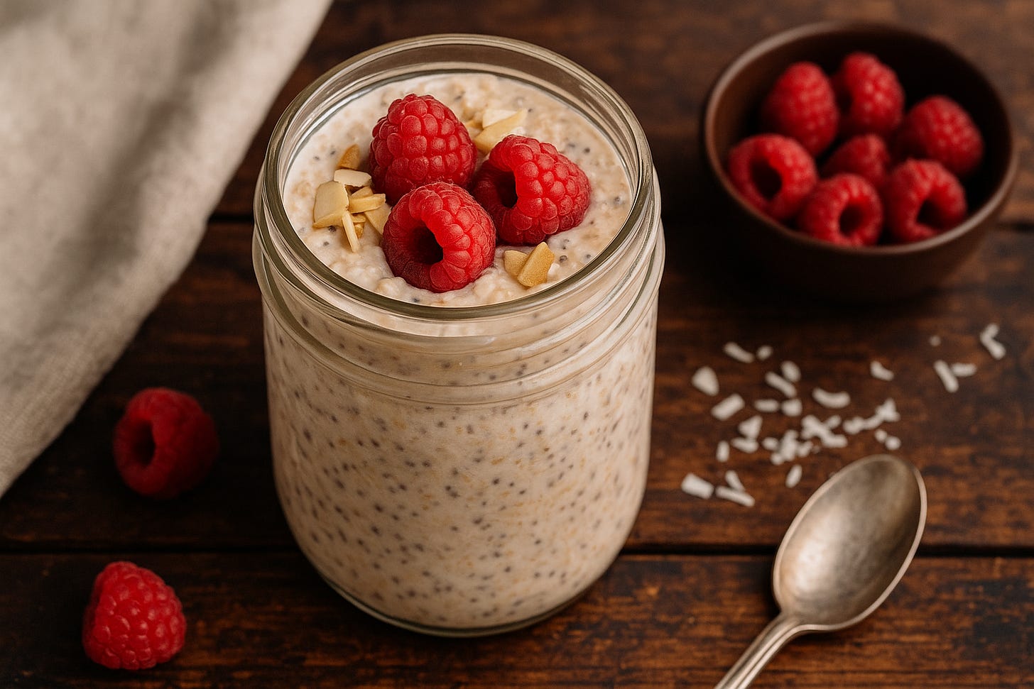 These overnight oats are creamy, lightly sweet, berry-forward, and packed with fiber, protein, and collagen. The raspberries add that bright tartness while bringing antioxidants that support skin health. And the chia? That’s your fiber + omega-3 combo to keep blood sugar stable and digestion happy.