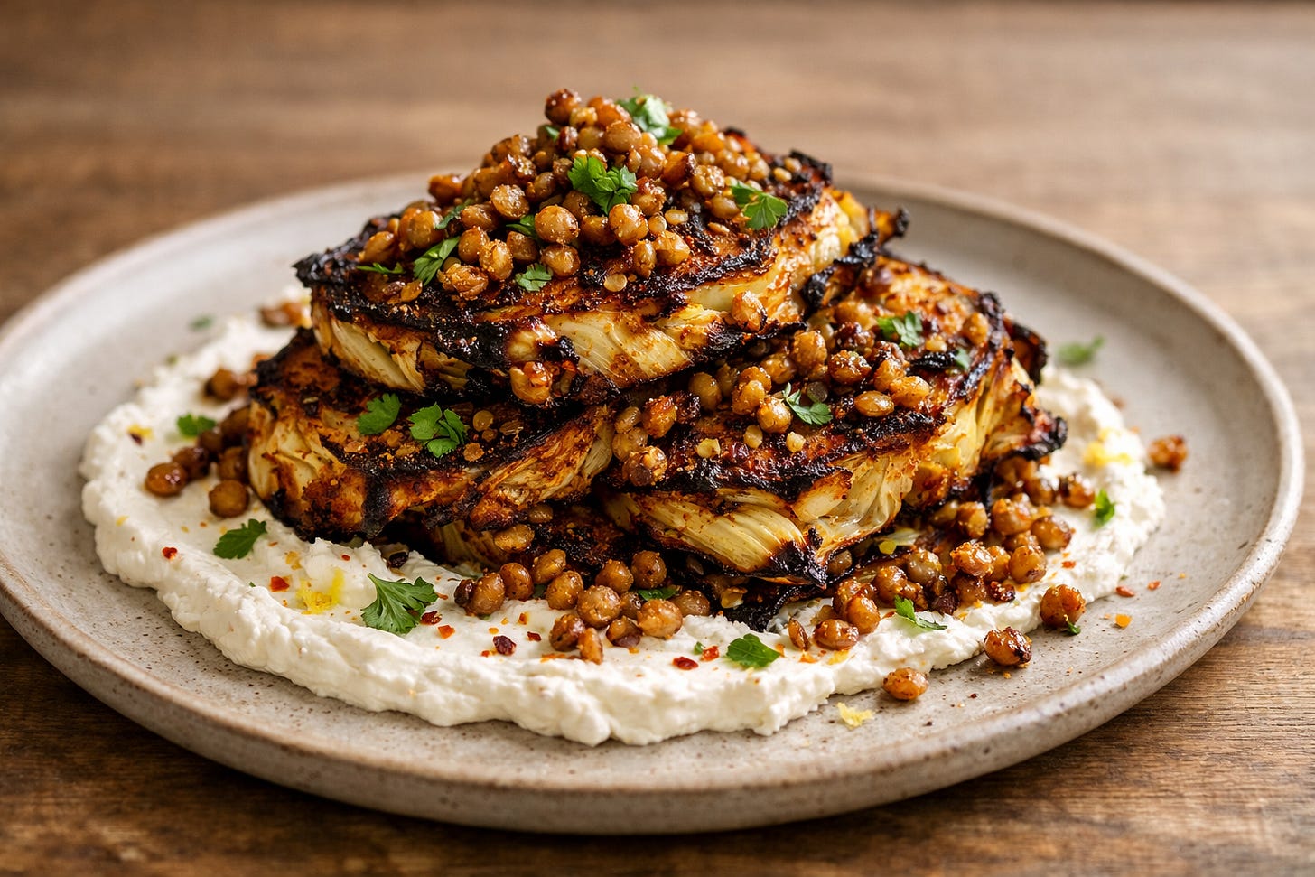 Crispy Harissa Cabbage Steaks with Whipped Feta + Lentil Crunch