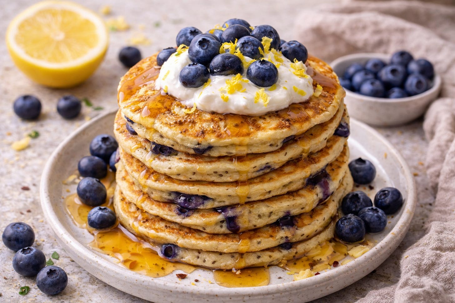These are built differently. Eggs, Greek yogurt, and protein powder bring 25 to 30 grams of protein. Chia seeds and blueberries add fiber that slows digestion and keeps energy steady. Oat flour gives you a balanced carb base with more nutritional value than white flour. And the lemon zest does something that’s hard to quantify but easy to taste, it lifts the whole batter and keeps these from feeling dense or heavy the way protein pancakes sometimes can.