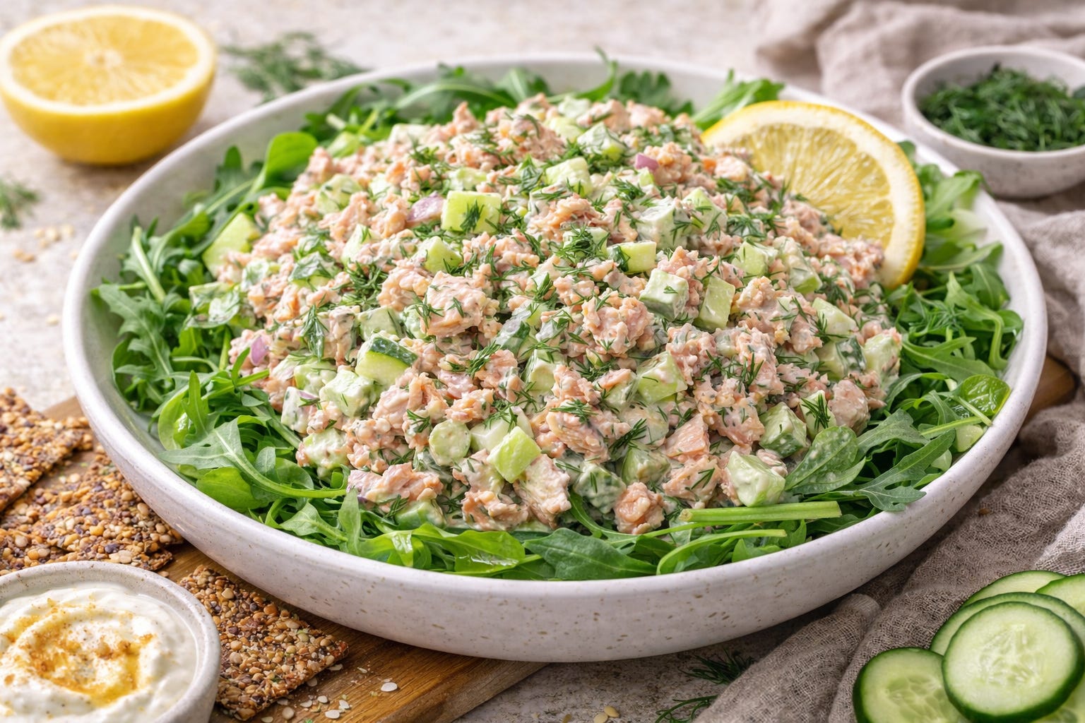 Cool, flaky salmon tossed in a creamy lemon-dill dressing with crisp cucumber, celery, and just enough red onion to give it some bite. Light enough to eat without that heavy, sluggish feeling that derails the second half of the day. Satisfying enough to actually bridge the gap to dinner without a 3pm snack situation developing.