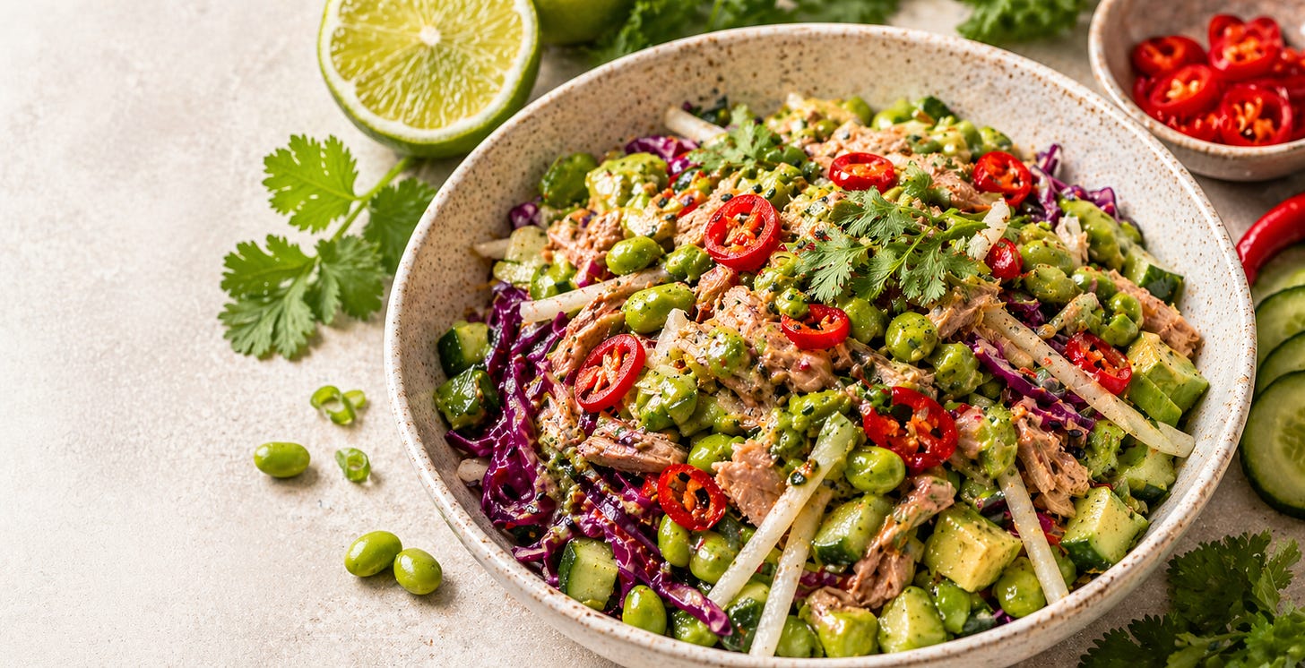 My Spicy Sesame Tuna started as an experiment and became one of the most exciting things I’ve made in months. A blended dressing with coconut aminos, sesame oil, fresh ginger, serrano, lime and cilantro poured over albacore tuna, edamame, jicama, purple cabbage, Persian cucumber and avocado. Let it sit for ten minutes and the whole thing transforms. The tuna absorbs that bright, spicy, herbaceous dressing and suddenly you have something that tastes like it came from somewhere with a menu.