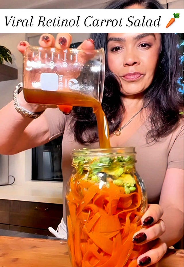 The “Retinol Salad” is a simple and delicious mix of carrots ribbons, vinegar, and sesame oil that’s suddenly everywhere on social media, thanks to its supposed skin benefits. And honestly? There’s some truth to it. Carrots are rich in beta-carotene — a precursor to vitamin A, or what we know in skincare as retinol.