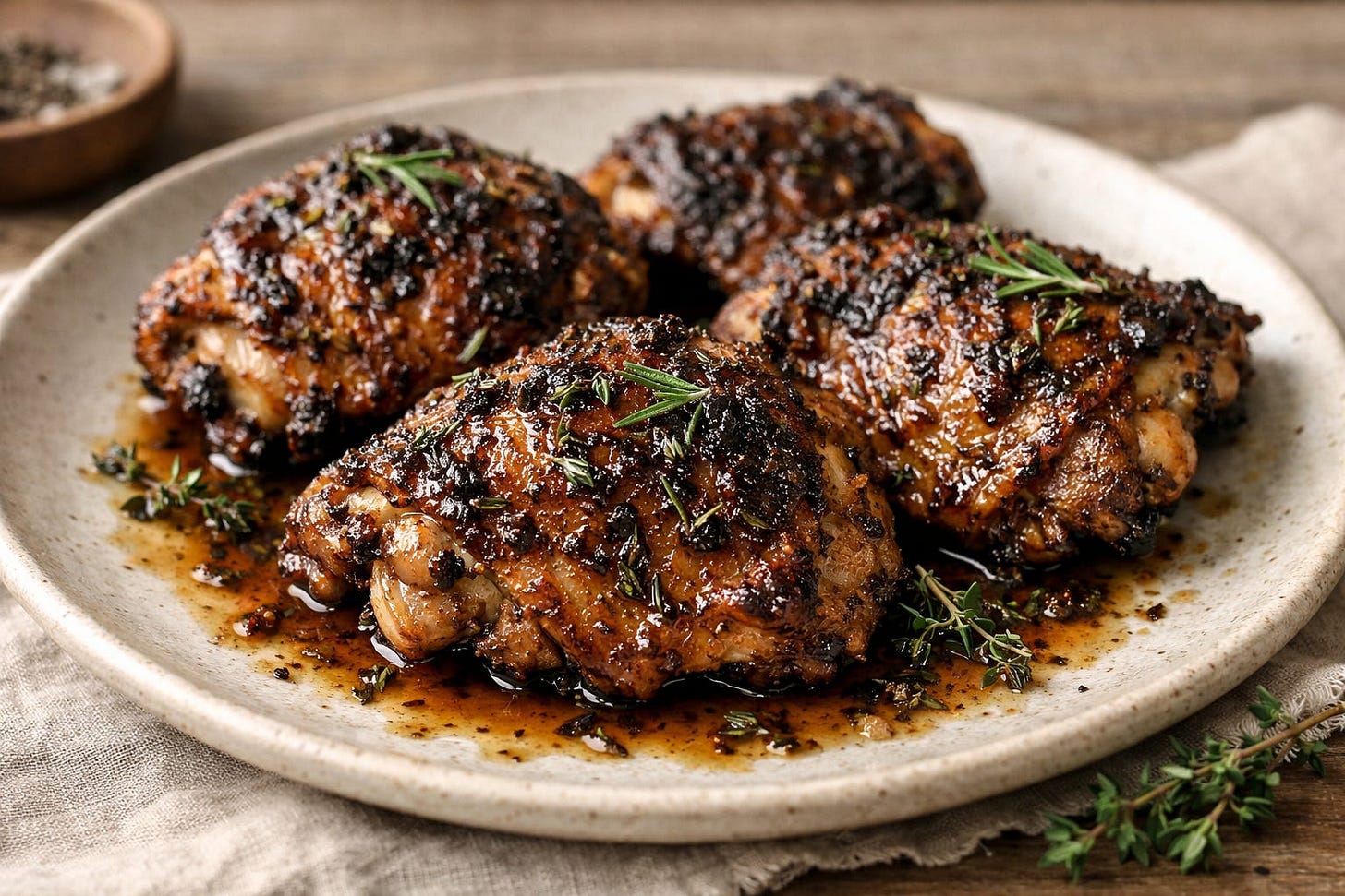 It’s one of those recipes you make once, then realize you don’t need to look it up ever again. Equal parts, a few herbs, a little heat, just enough sweetness for browning… and suddenly plain chicken thighs become something you crave.