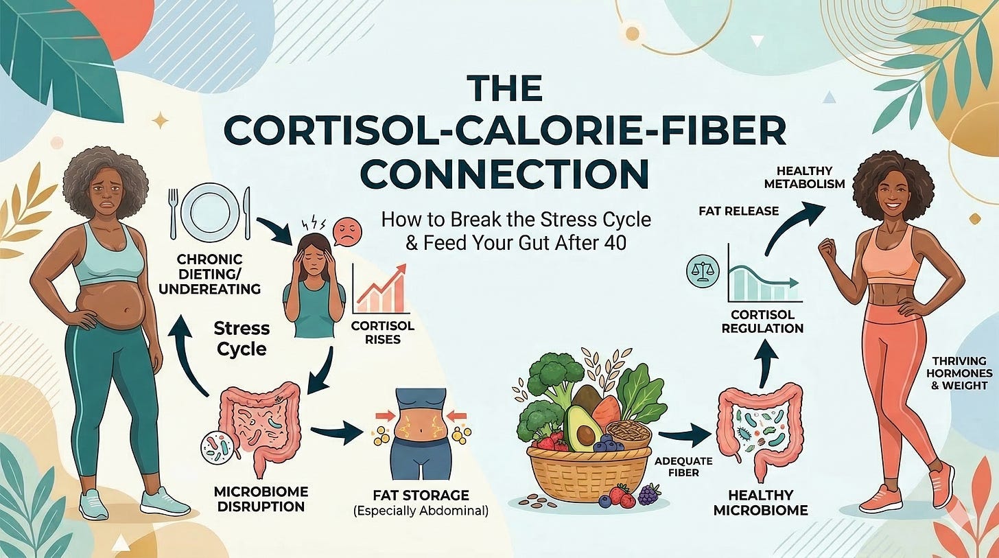 This is not about eating more fiber instead of restricting calories. It is about understanding that restriction raises cortisol, cortisol disrupts your gut, and your gut is one of the primary systems controlling whether your body is in fat-storing or fat-releasing mode.