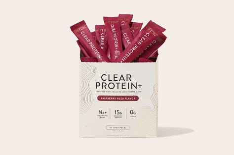 Arrae Clear Protein Protein, collagen, and electrolytes all in one stick pack. 15g of grass-fed hydrolyzed whey plus collagen peptides, in a light raspberry yuzu drink that actually tastes good. No blender, no chalky aftertaste, no bloating. The hydrolyzed format means it absorbs faster and sits much easier on the gut than traditional protein powders. I stir one into water mid-morning or after a workout. It fits the Thrive Method framework perfectly because it counts toward your daily protein total and supports collagen at the same time.