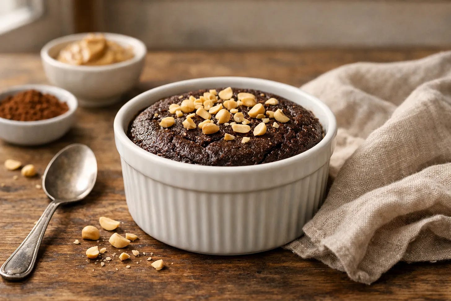 Warm chocolate dessert that you whisk together in one bowl, pour into a ramekin, and pull out of the oven 20 minutes later to eat with a spoon. Fudgy in the center, slightly set around the edges, rich without being heavy. No flour, no protein powder, no drama. Egg for structure, Greek yogurt for moisture and protein, peanut butter for richness, cocoa for depth. Around 22-25g of protein for the whole ramekin. It tastes like dessert. It functions like a Thrive Method meal. That is the whole point.