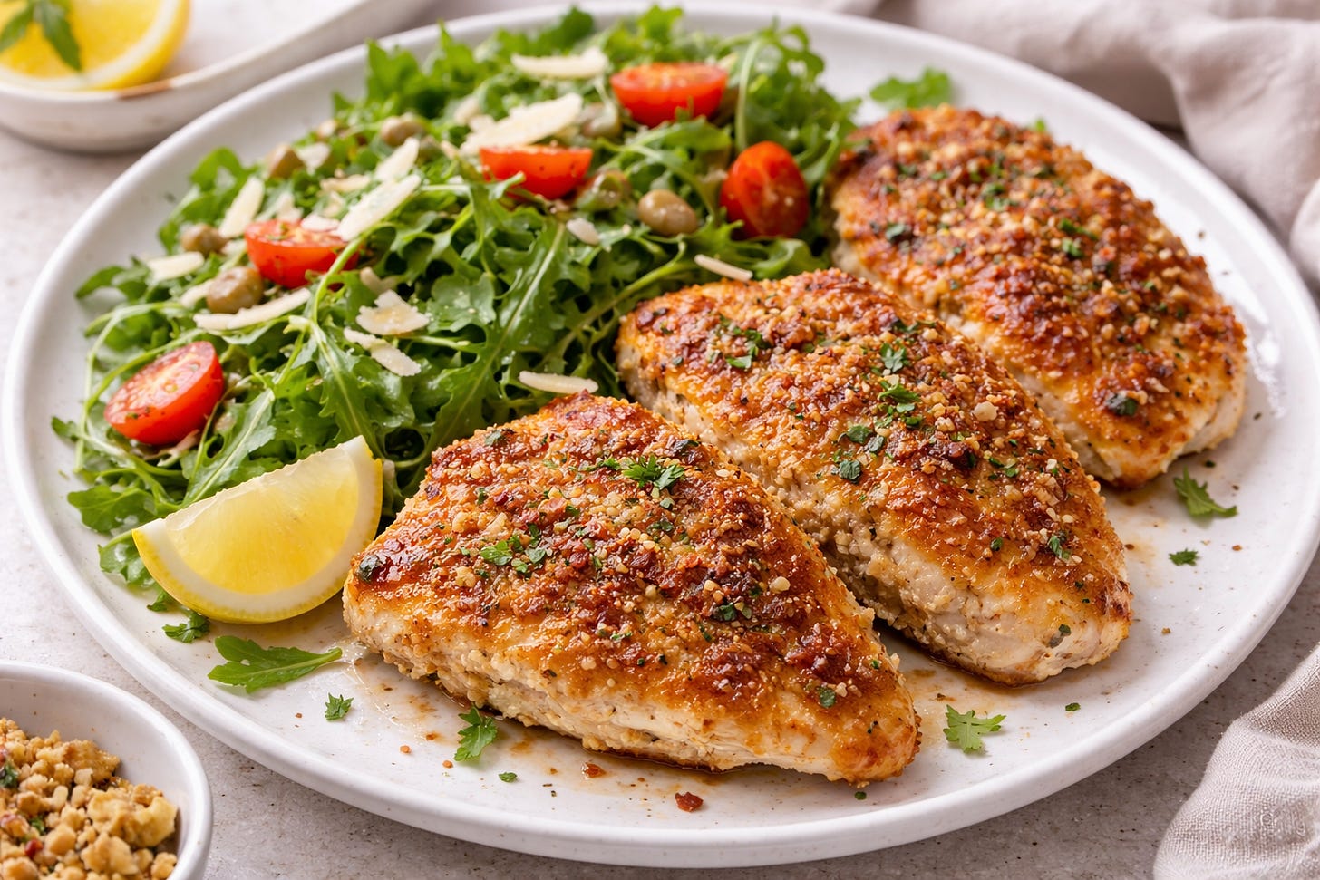 This is the kind of dinner that makes people ask where we ordered from. Golden, garlicky parmesan crust on the outside. Juicy chicken on the inside. A pile of peppery arugula tossed in lemon and olive oil that wilts just slightly against the warm chicken and cuts through the richness perfectly. 40 to 45 grams of protein per serving. Under 30 minutes. One pan. The contrast of warm and crispy against cold and bright is what makes this feel like a proper restaurant-quality plate at home.