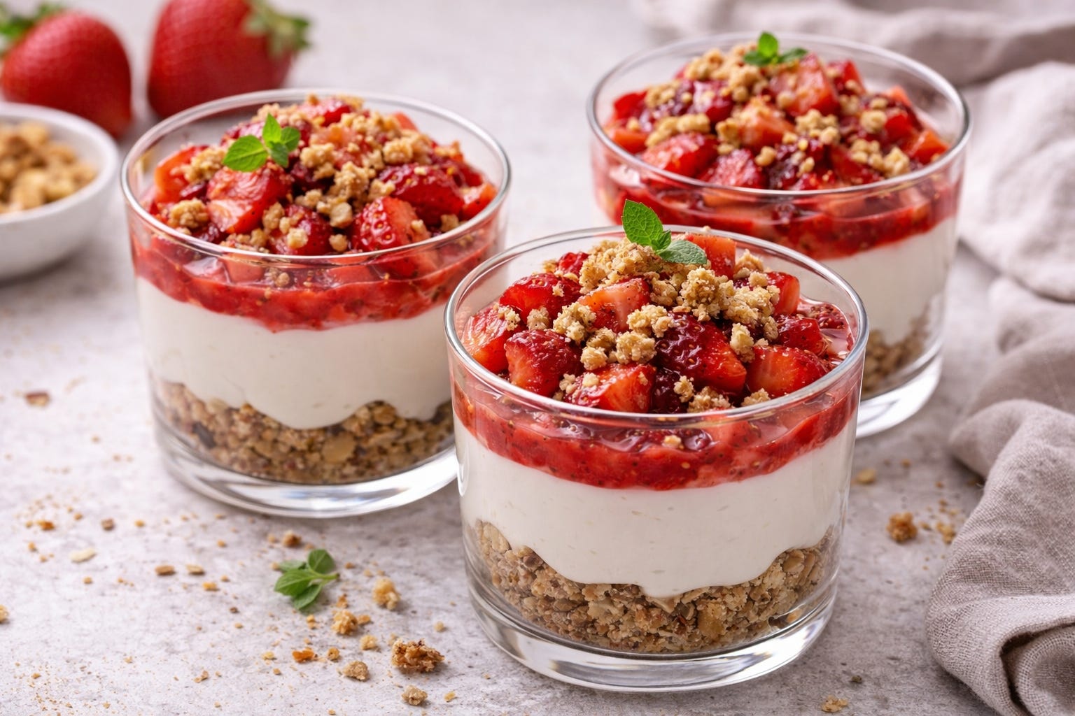There are moments in the afternoon when you want something sweet and you want it now. Not a project, not a production. Just something that actually satisfies instead of feeding the craving further. Greek yogurt and cream cheese bring the protein and that signature cheesecake tang. Soft jammy strawberries that have been sitting in a little lemon juice until they go slightly syrupy. A buttery almond flour crumble on top. The same craving, a much better outcome. Make it tonight, eat it tomorrow afternoon when you need it.