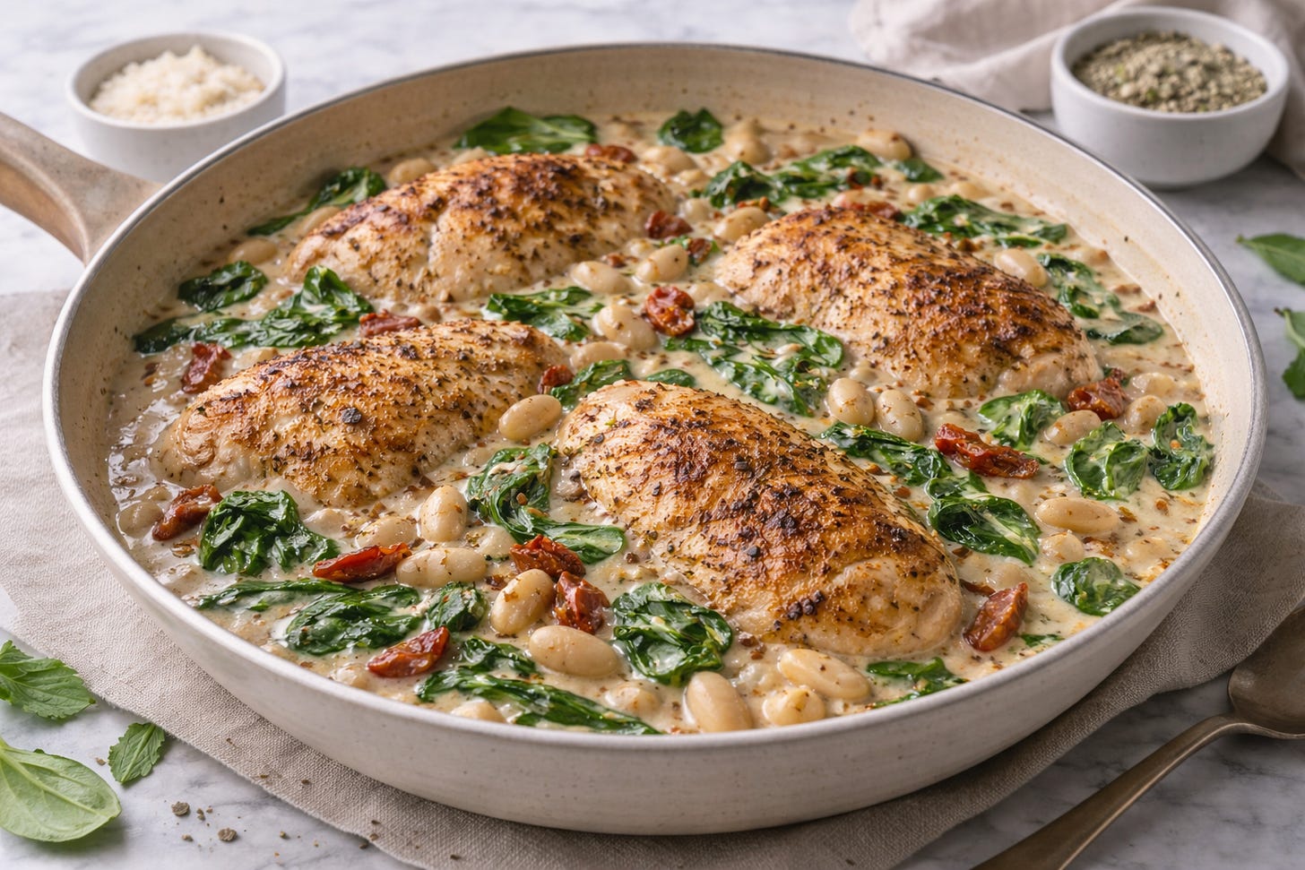 This one checks every box. Chicken thighs for protein, white beans for fiber and staying power, sun-dried tomatoes and a creamy sauce that makes it feel indulgent without being off-plan. The white beans alone add around 7–8g of fiber per serving, which means this dinner is quietly doing gut health work while you’re just enjoying a really good meal. This is the kind of recipe that makes the Thrive Method sustainable: it never feels like you’re eating “diet food.”